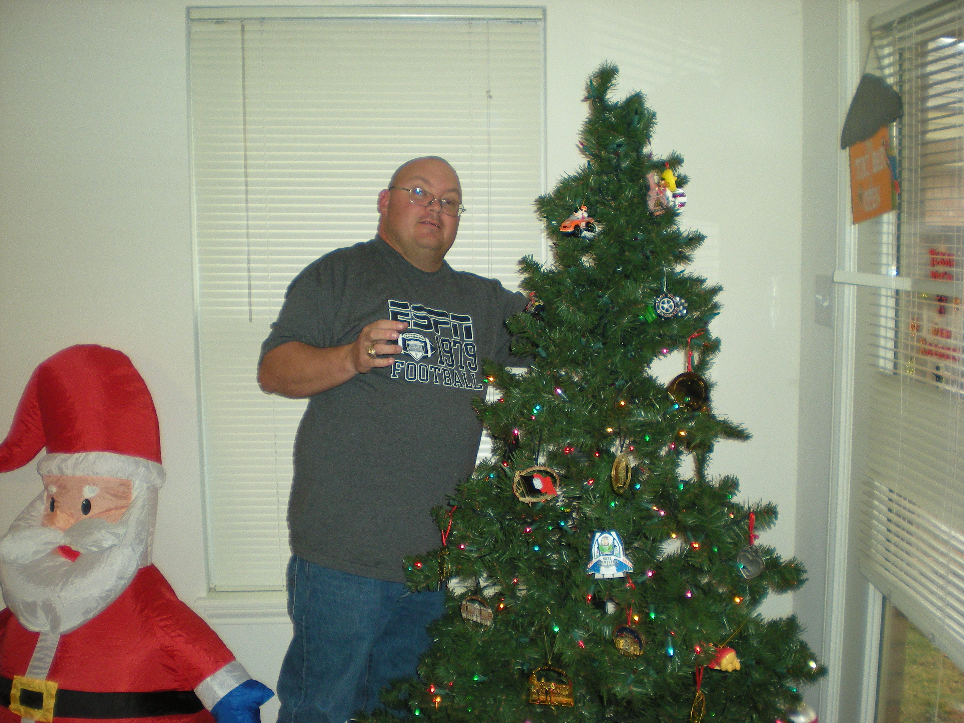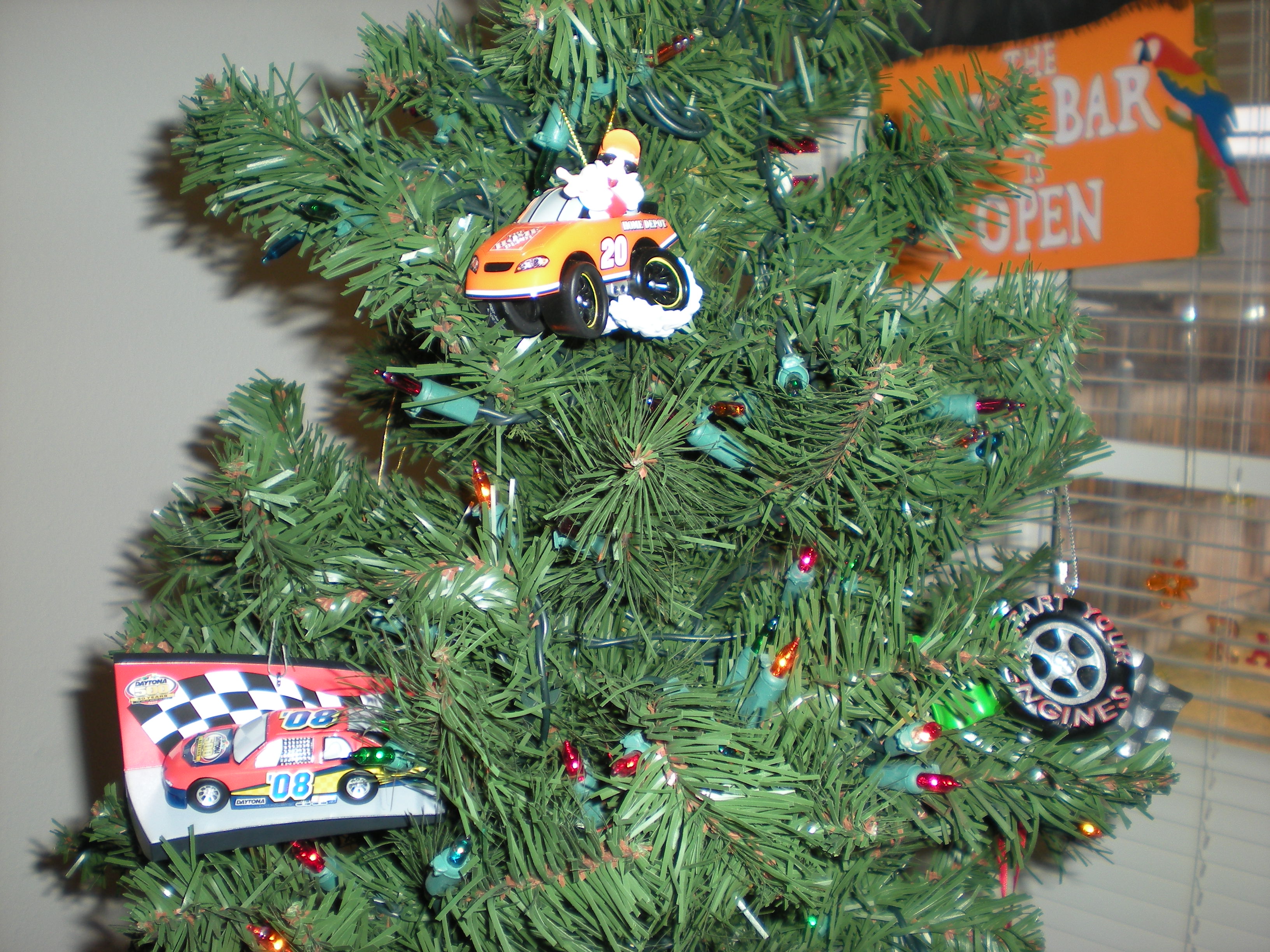 Here are the NASCAR ornaments on the tree. The tire ornament says “Gentleman Start Your Engines”. Of course no Christmas tree of mine is complete without that ever popular Tony Stewart ornament. I didn’t take a picture of it, but I do have a Redneck ornament on the tree…which states “You might be Redneck if you think the last four words of the National Anthem are gentleman start your engines. Please note the sign behind the Christmas tree…”The Bar is Open”. Actually it says, “The Tiki Bar is Open.” (part of it is hidden by the tree branch). This is a decoration from my birthday party back in June. I like the sign so why not have it up year round. Of course some of you may now be thinking…”you might be a Redneck if….and to which I respond…there is no “you might be” because I am one..and damn proud!