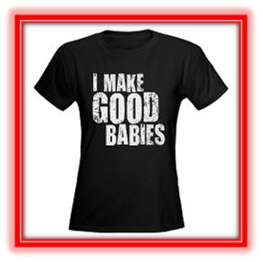Was he trying to let others know (specifically the female persuasion) one of his many talents? Does he already know for a fact that he makes good babies? I have to give the guy credit making such a bold statement about himself. I would have to say it might be a great way to pick up some unsuspecting gal at the local honky-tonk. Perhaps I should wear this one and let him know I how I feel about him.