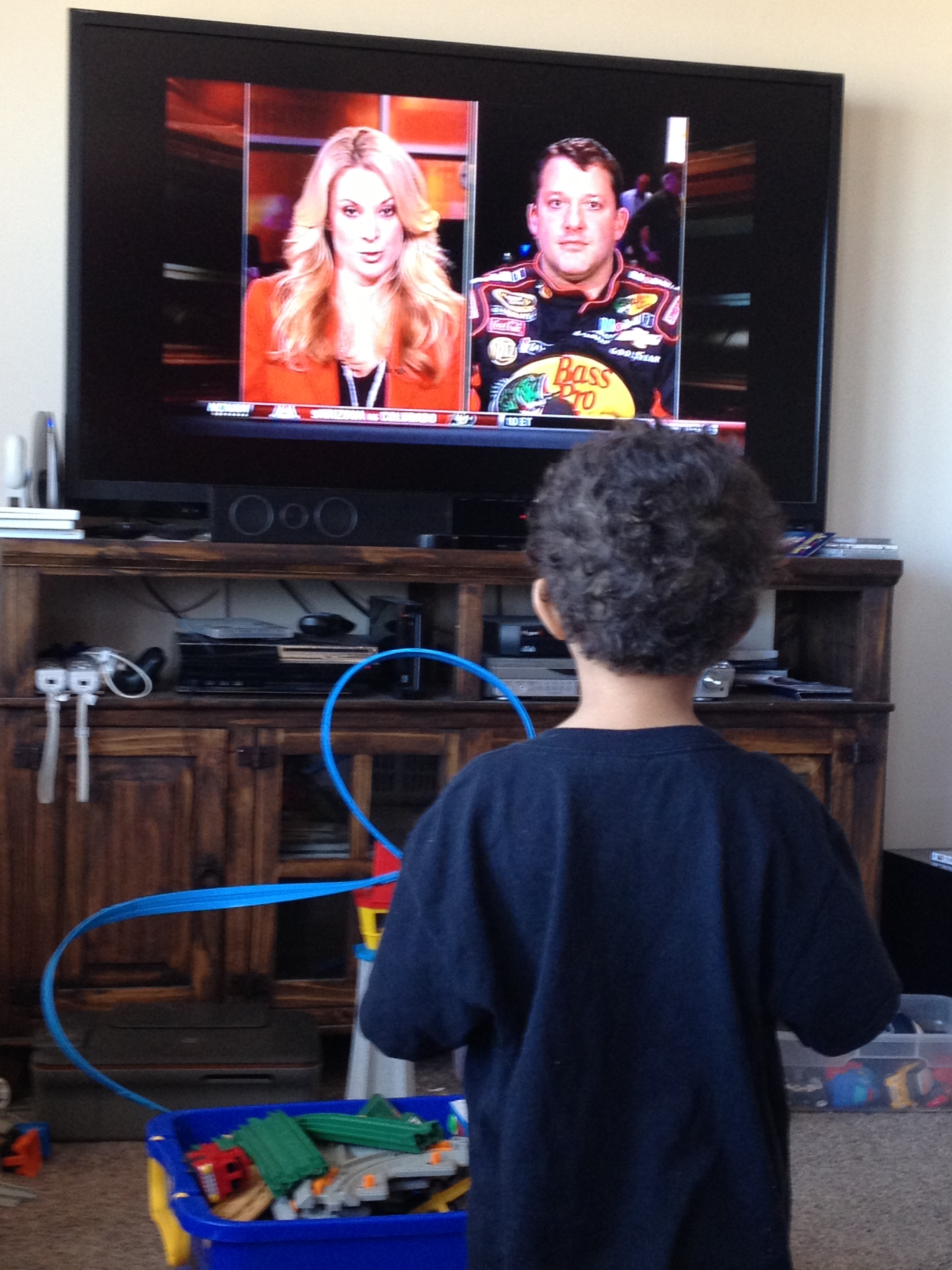 I definitely had to multitask today (doing laundry and enjoying Media Day). IMG_1622 At one point in the day I had Sirius NASCAR Radio, NASCAR. com, and ESPN playing all at the same time. Man it is a good thing I am not ADHD or I would have blow some kind of gasket. I wanted to make sure I wasn’t missing anyone I wanted to see or hear. I think I like both Sirius and NASCAR.com’s coverage.  It seemed more conversational than the ESPN coverage.  All were of course very informing and entertaining.  I got a chance to see Tony Stewart not once but twice today.  My youngest loves Tony Stewart and he too was enjoying some of media day.  Frankly he was building a race track with his Geotrax on the floor during most of it, but when Tony was on he stopped to watch.  He is DEFINITELY my son!