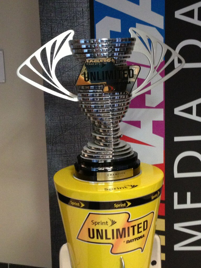 sprint unlimited trophy 2013Sprint Unlimited (aka Bud Shootout)–This year the fans were able to vote for how the Sprint Unlimited would play out.  This included segment duration, pit stops, driver elimination and yes, even the driver line-up.  The race segment durations are as follows: 1st segment-30 lap, 2nd segment-25 laps and 3rd segment-20 laps. Voting for the pit stop options will close after the green flag drops for the first segment.  The choices will be 4 tires, 2 tires, or no stop at all after the end of the first segment.  Fans have until the green flag of the segment to vote how many drivers will be eliminated, your choices, 0, 2, 4 or 6.  The other interesting part of this is how will the race lineup be determined.  This too is fan driven.  Only the fans that are attending the race on Saturday will have the luxury of setting the starting grid.   This should be interesting!  Man sucks to be a crew chief during this race, but hey, that’s why they get paid the big bucks.  They will definitely earn some come Saturday night. Here’s a picture of the trophy the winner of the race will receive on Saturday. (Photo courtesy of Mike Bagley’s Twitter feed).