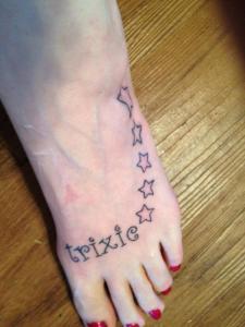 - I got a new tattoo today. This isn’t my first tattoo. I got one back in 2000 in honor of my 30th birthday. I was planning to get one in honor of turning 40, but didn’t get around to things until today. I debated back and forth on what to get…I mean after all this thing was going to be a permanent part of me. I was going to get a checkered flag with just my nickname “Trixie”, but I decided on the following.